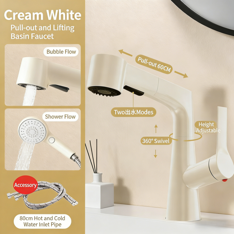 Cream White Pull-Out & Lifting Bathroom Faucet