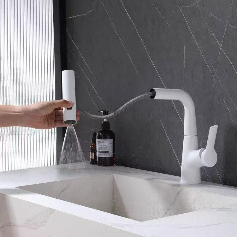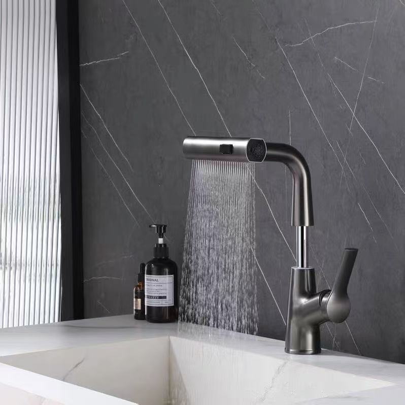 All-copper hot & cold mixer faucet for bathroom vanity, 360° swivel, height adjustable, 2-mode pull-out spray.