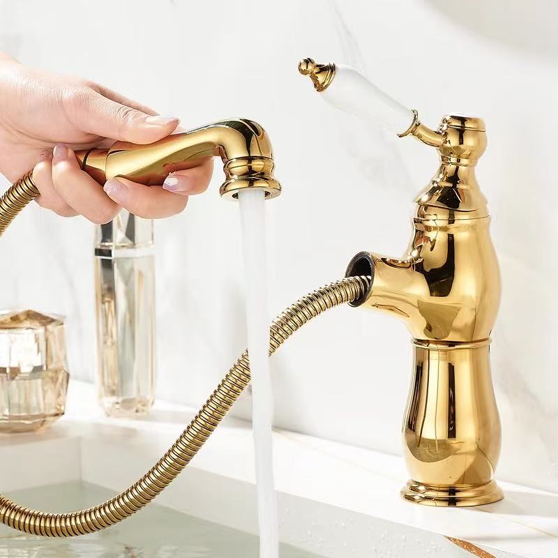 French Retro Gold All-Copper Pull-Out Bathroom Faucet with Ceramic Handle